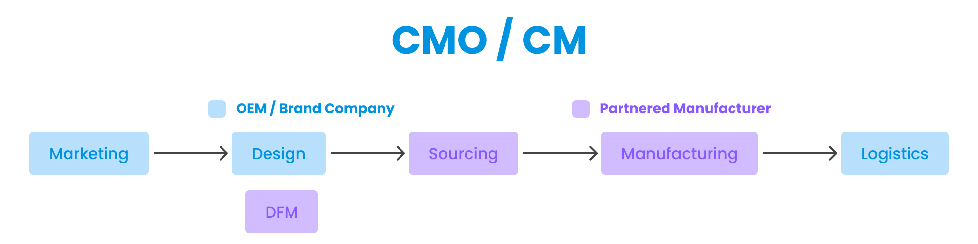 You hand over the recipe for a triple-layer matcha tiramisu cake idea. The bakery suggests tweaking ingredient ratios and oven temperature to ensure the cake can be whipped out perfectly at scale. The bakery then sets up the kitchen to bake hundreds, box them with your branding, and get them ready to deliver. Here, the Bakery is the CM and you are the OEM.